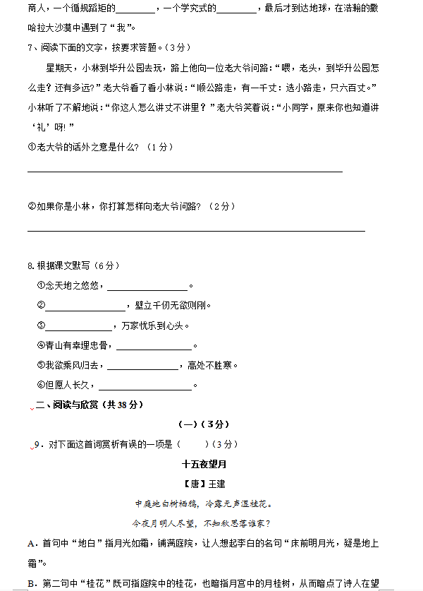 無錫宜興官林學區2016-2017學年初一上期中語文試題(2)
