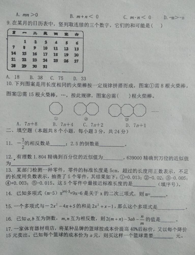 2021湖北隨州大堰坡中學七上數學期中試卷(圖片版)(2)