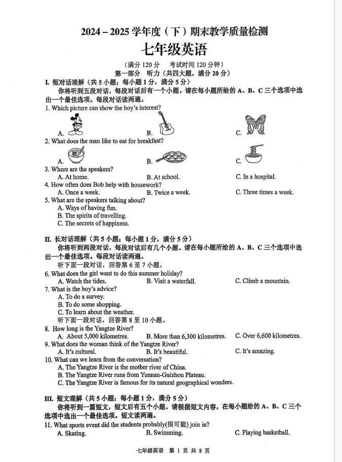相關(guān)推薦:2024-2025學(xué)年全國(guó)各省市七年級(jí)下冊(cè)各科期末真題及答案匯總