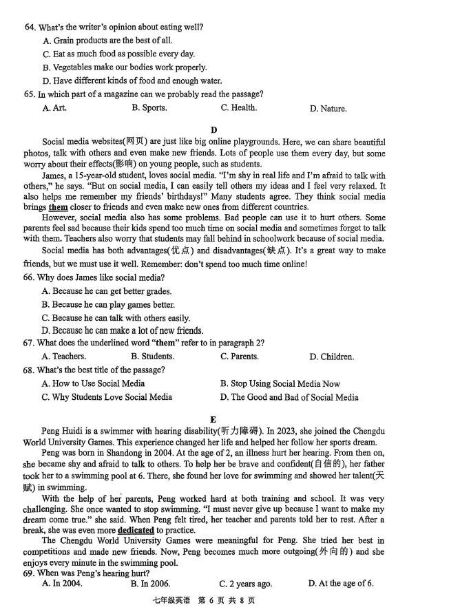 2024-2025學年安徽合肥肥西縣七年級下學期英語期末真題(圖片版)(6)