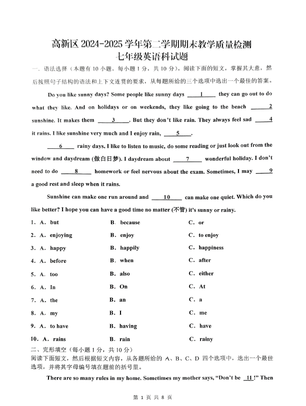 2024-2025學年廣東肇慶高新區七年級下學期英語期末真題(圖片版)