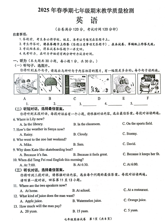 相關(guān)推薦:2024-2025學(xué)年全國(guó)各省市七年級(jí)下冊(cè)各科期末真題及答案匯總