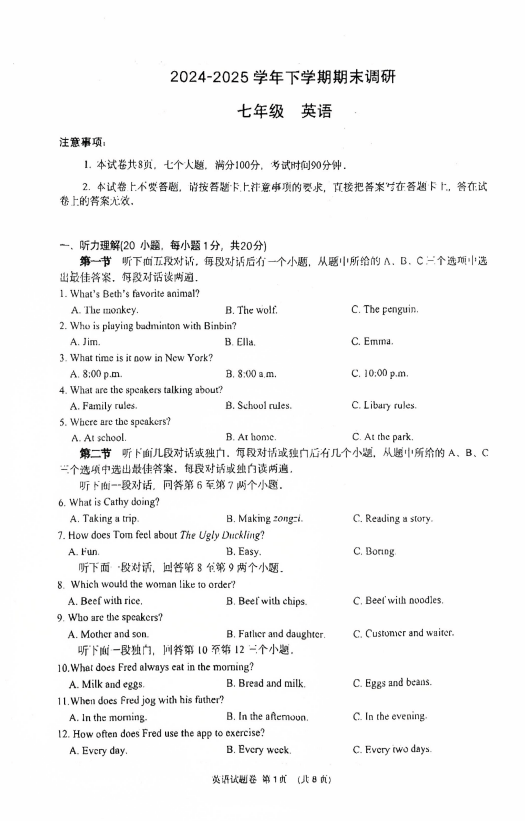 中考網(wǎng)整理了關(guān)于2024-2025學(xué)年河南鄭州高新開發(fā)區(qū)七年級下學(xué)期英語期末真題(圖片版),希望對同學(xué)們有所幫助,僅供參考。