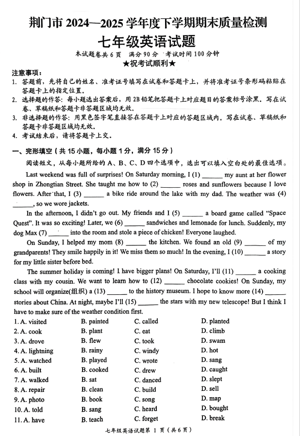 2024-2025學年湖北荊門七年級下學期英語期末真題(圖片版)