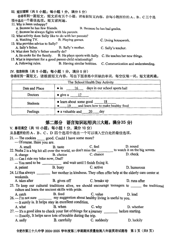 2024-2025學年安徽合肥三十八中學八年級下學期英語期末真題(圖片版)(2)