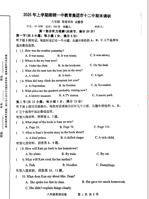 資料內(nèi)容:【25年 初一 初二 初三期末考試真題】