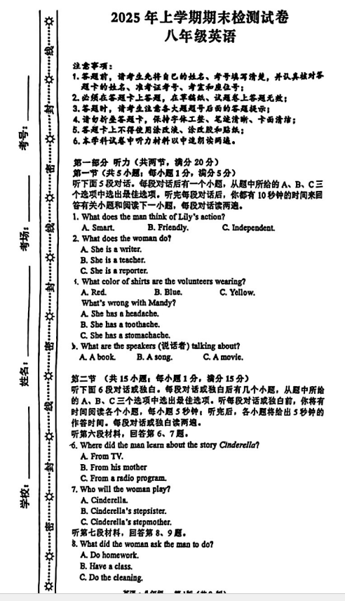資料內(nèi)容:【25年 初一 初二 初三期末考試真題】