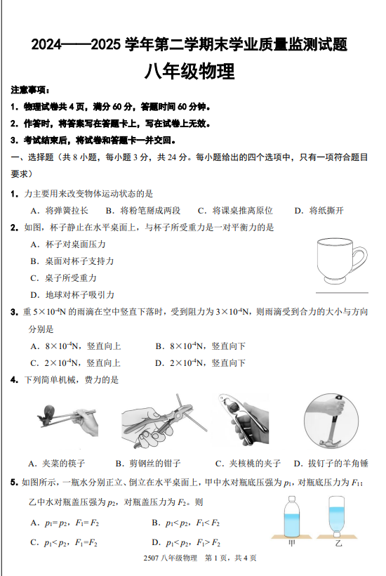 中考網整理了關于2024-2025學年內蒙古赤峰巴林左旗八年級下冊物理期末真題(圖片版),希望對同學們有所幫助,僅供參考。
