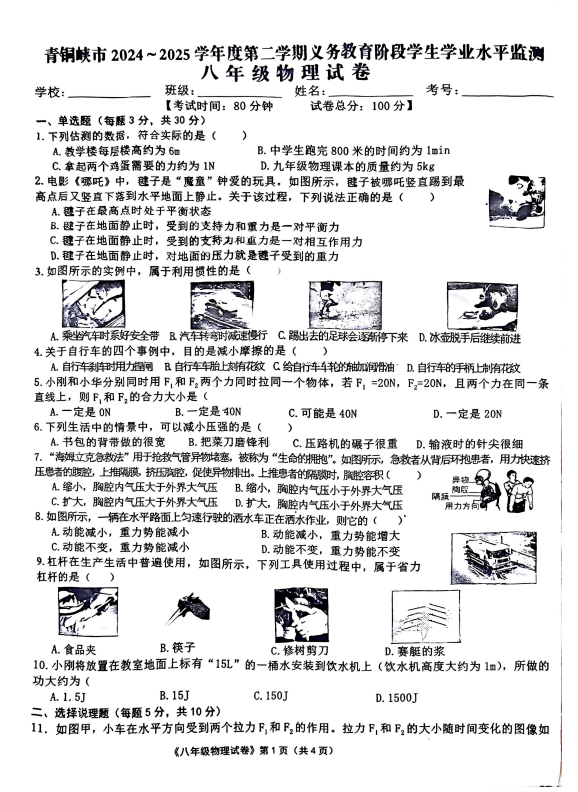 中考網整理了關于2024-2025學年寧夏吳忠青銅峽市八年級下冊物理期末真題(圖片版),希望對同學們有所幫助,僅供參考。